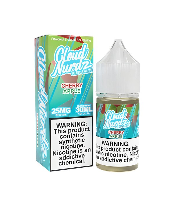 Cloud Nurdz Cherry Apple Iced Salt Likit, tatlı kiraz ve taze elma aromalarını buz ferahlığıyla birleştirir. 30 mL, 25 mg / 50 mg nikotin seçenekleri, 60VG/40PG oranı.
