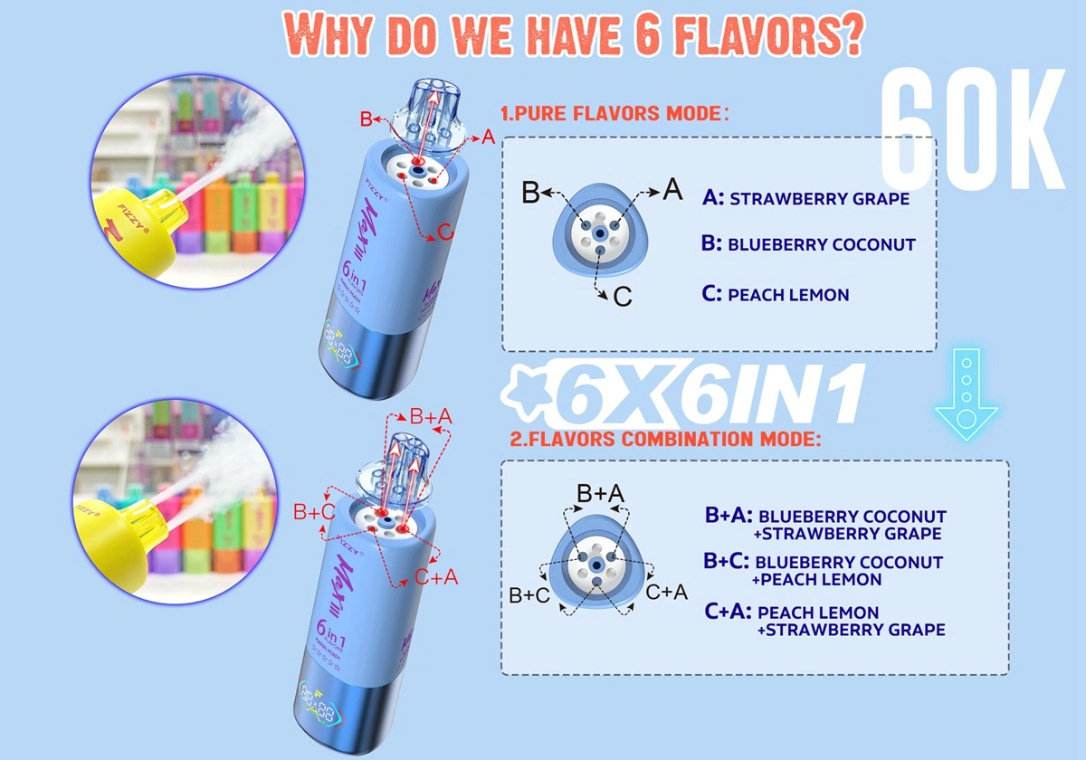 - 6-in-1 Aroma Dizaynı: Cihazda birden fazla aroma ve karışık tat deneyimi sunma yeteneği