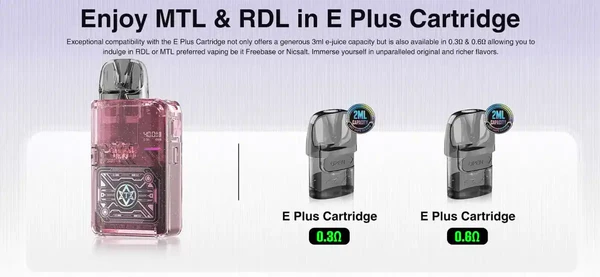 • 0.3 Ohm ve 0.6 Ohm E-Plus pod kartuşlar — MTL ve RDL içim stillerine uygun