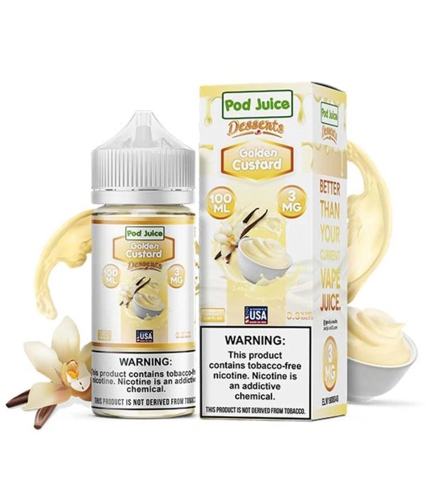 Pod Juice Desserts Golden Custard, zengin vanilya kreması ve hafif karamel notalarının birleşimiyle yumuşak, tatlı ve dolgun bir lezzet sunan elektronik sigara likitidir. 70VG / 30PG oranı sayesinde pürüzsüz içim ve yoğun aroma dengesi sağlar. 100 mL şişede; 0 mg, 3 mg ve 6 mg nikotin seçenekleriyle üretilmiştir.