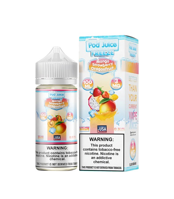 Pod Juice Freeze Mango Strawberry Dragonfruit E-Likit, tropikal mango, tatlı çilek ve egzotik pitaya (dragonfruit) aromalarının buzlu ferahlıkla birleştiği canlı bir karışımdır. 70VG / 30PG oranı sayesinde yoğun aroma ve pürüzsüz buhar deneyimi sunar. 100 mL şişede; 0 mg, 3 mg ve 6 mg nikotin seçenekleriyle üretilmiştir.