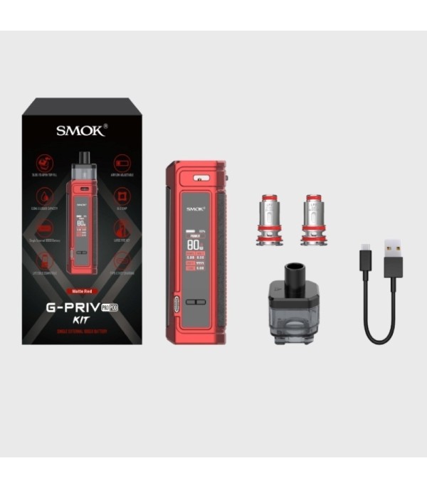 Smok G-PRIV PRO Pod Mod, harici bir 18650 pil ile çalışan bir cihazdır, 5.5 mL'lik geniş likit depolama kapasitesine, 5Watt ila 80Watt arasında ayarlanabilir akım çıkış gücüne ve Smok LP2 coilleriyle uyumluluğa sahiptir. Aynı zamanda hızlı şarj özelliği ve kullanıcı dostu birlikte getirme prensibiyle tasarlanmıştır. Smok G-PRIV PRO Pod Mod, dolumu kolaylaştıran üstten dolum tasarımına, etkili bir ateşleme düğmesine ve şık tasarımına sahip, ayrıca 6 farklı renk seçeneği sunan bir elektronik sigaradır.
