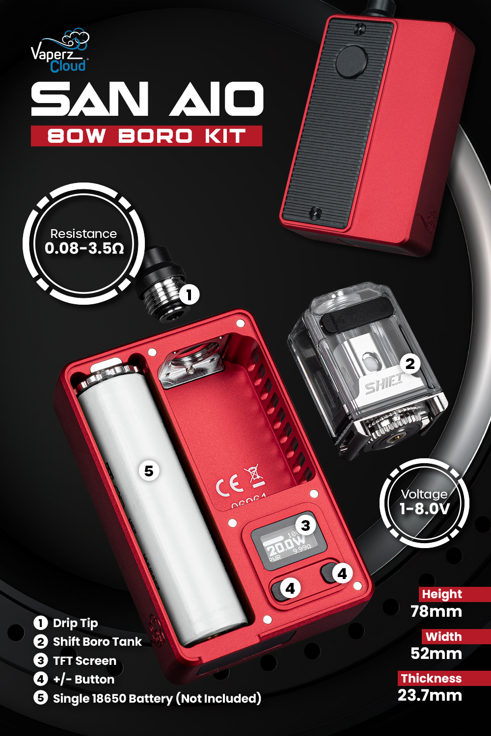 San AIO Boro Kit By Vaperz Cloud X Gerobak, tek 18650 batarya ile çalışan, 5-80W çıkış gücü, 0.08-3.5 Ohm direnç aralığı ve Shift Boro Tank ile birlikte gelen güçlü bir mod-tank setidir. USB-C hızlı şarj, ayarlanabilir hava akışı ve coil uyumluluğu sayesinde hem aroma hem buhar deneyimini kişiselleştirmek isteyen kullanıcılar için idealdir.