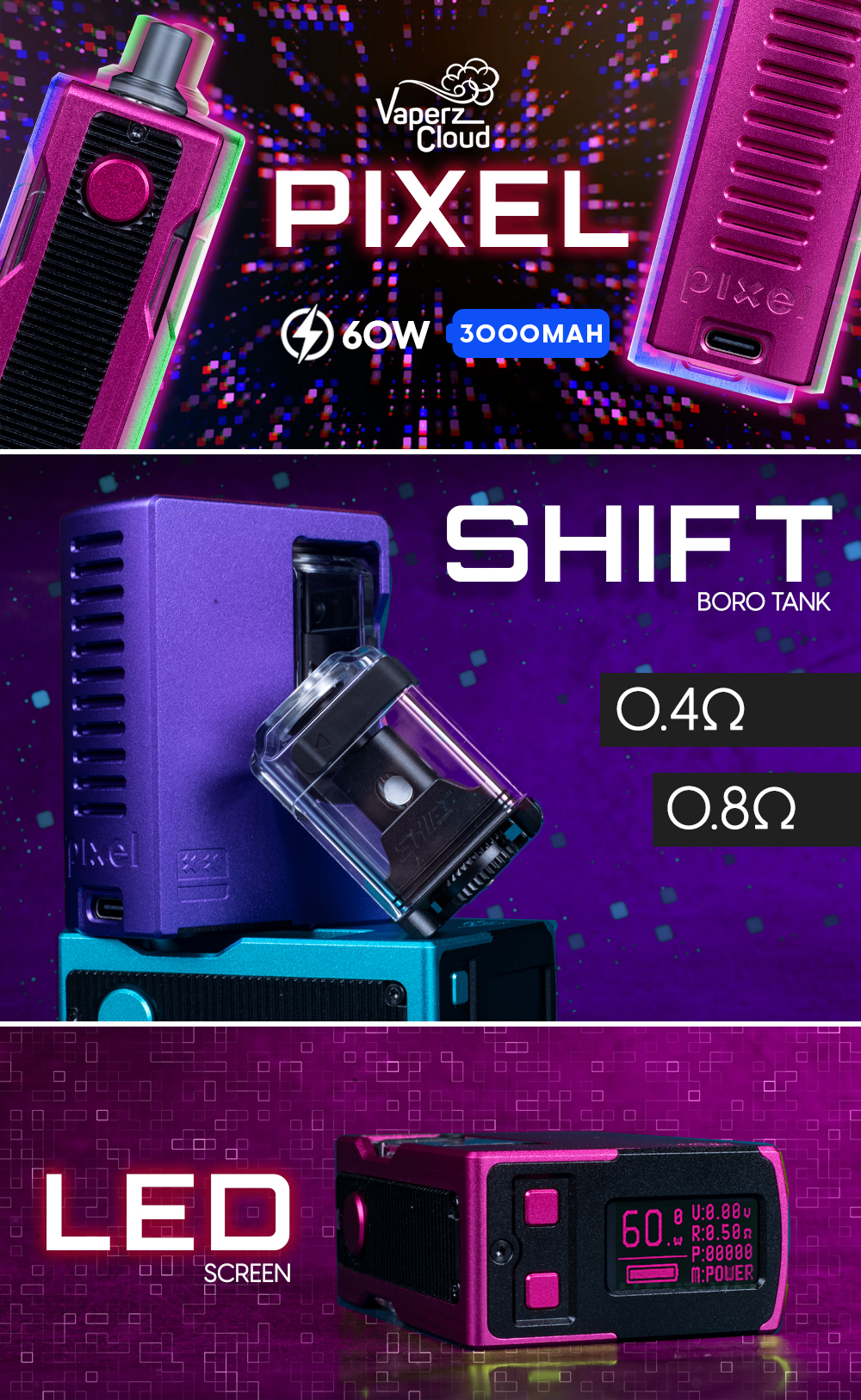 Vaperz Cloud Pixel AIO Boro Kit, 60W’lık çıkış gücü, 3000mAh bataryası ve Shift Boro Tank ile birlikte gelen VC Tech mesh coil seçenekleri ile yüksek performanslı, kompakt bir AIO vape çözümüdür. USB-C 3A hızlı şarj, gizli ekran ve estetik renk seçenekleriyle hem görünüm hem kullanım rahatlığı sağlar.