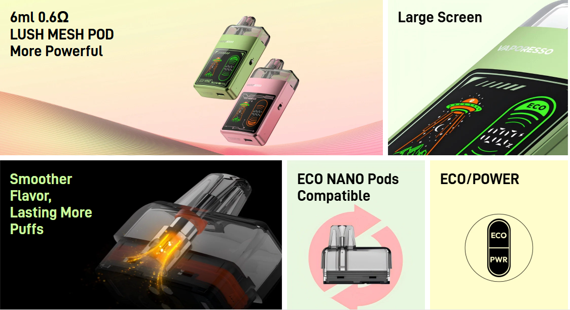 Vaporesso Eco Nano Pro Pod Vape Kit, 1000mAh bataryası, COREX 2.0 teknolojisi ve 0.6 Ohm / 0.8 Ohm / 1.2 Ohm direnç seçenekleriyle hem aroma hem buhar performansını dengeler. ECO ve Power modları ile cihazı kullanımınıza göre optimize edin. Büyük ekran, uyumlu pod seçenekleri ve hafif yapısıyla hem yeni kullanıcılar hem de deneyimli vaper’lar için güvenilir bir tercihtir.