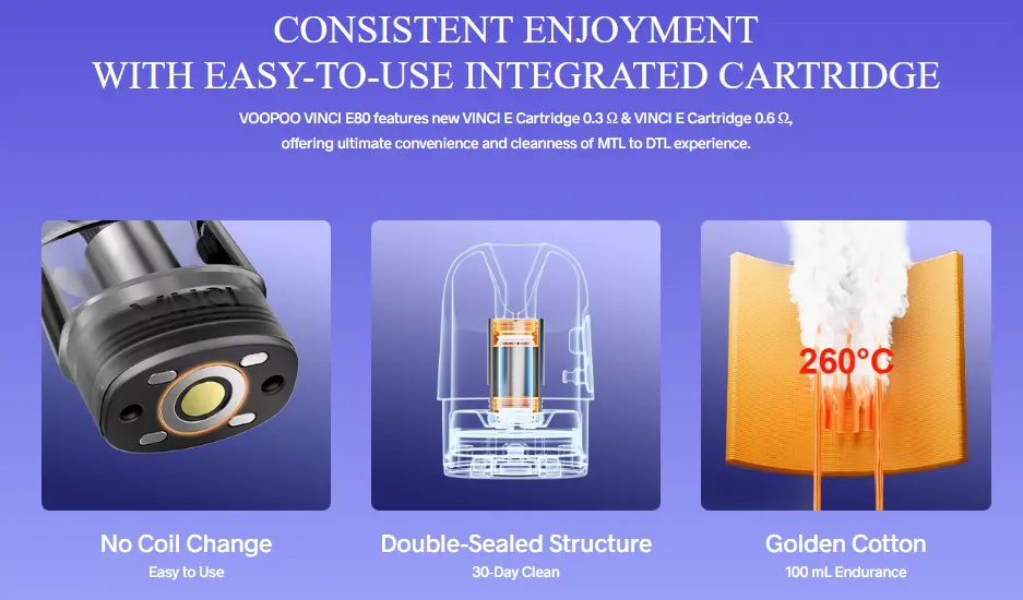 Voopoo Vinci E80, yüksek kapasiteli bataryası ve güçlü çıkış seçenekleriyle dikkat çeken bir pod sistemidir. Entegre 3000mAh bataryası ile tüm gün kullanım sağlar; parlak 1.47" renk TFT ekranı sayesinde güç, batarya durumu ve puff bilgilerini kolayca takip edebilirsiniz. USB-C 5V/2A şarj ile hızlı dolum yapılır, sızdırmaz yapıdaki mesh pod’lar lezzeti korur ve kullanım kolaylığı sunar.