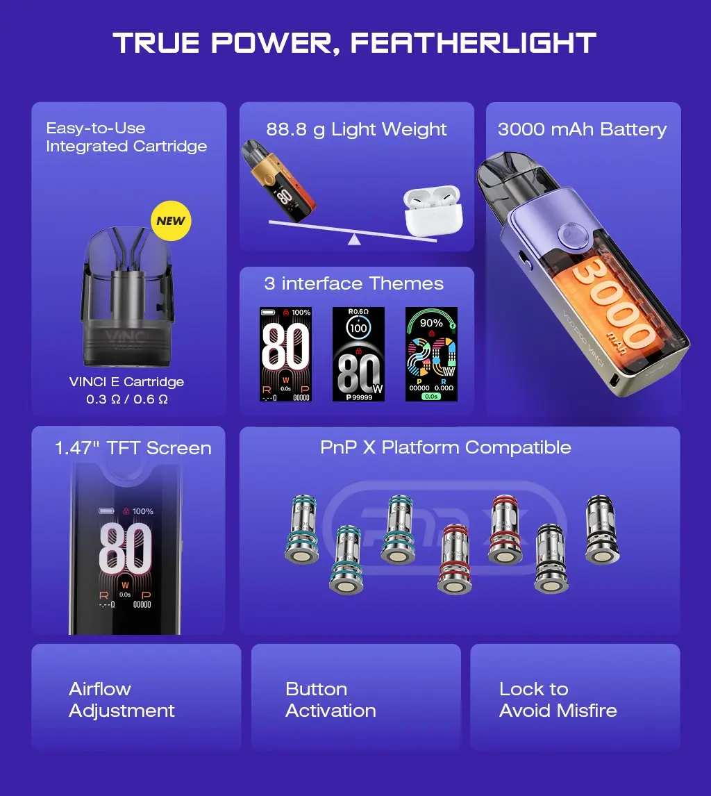 Voopoo Vinci 3 Pod Mod, gelişmiş bir pod mod cihazı olarak kullanıcılarına 50 watt'a kadar ayarlanabilir güç sunar ve entegre 1800 mAh bataryası ile uzun süreli kullanım sağlar.